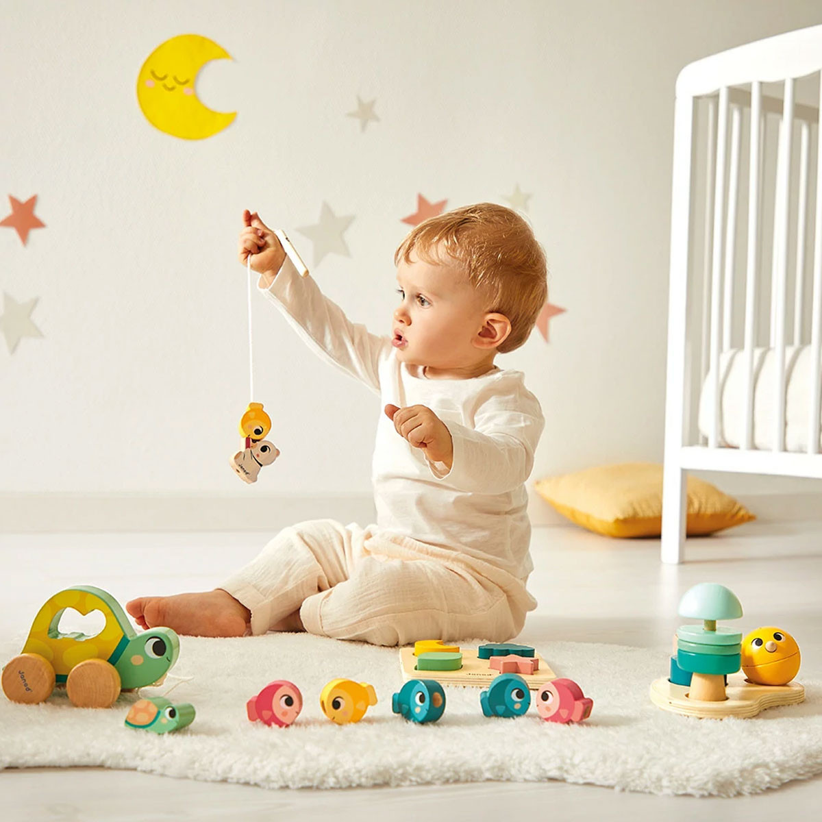 Slatka drvena kornjača sa svojom bebom poziva dete na prve korake! Beba kornjača je odvojiva, pa dete može vući mamu konopcem ili je nositi držeći je za oklop. Savršeno za podsticanje samostalnog kretanja i hodanja.