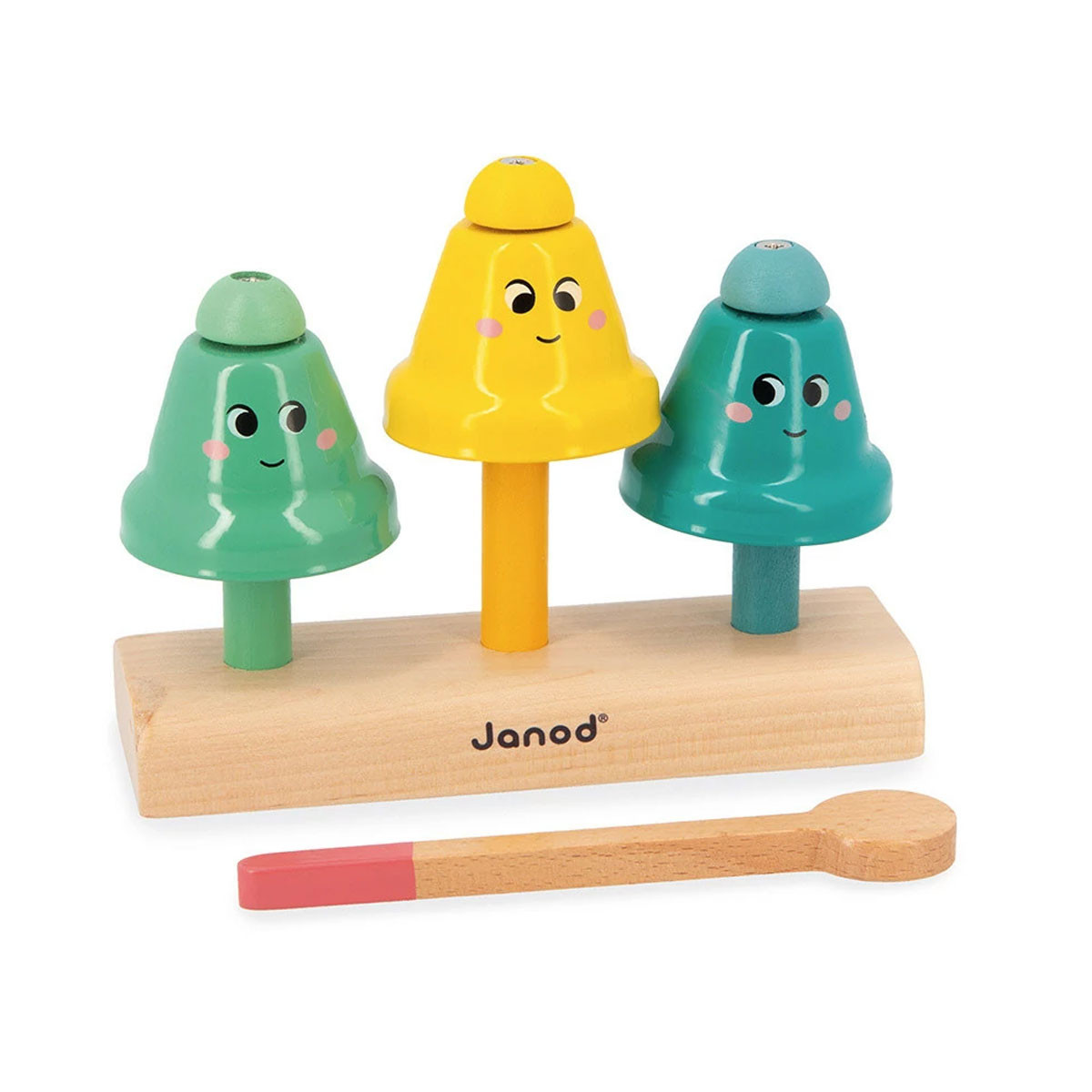 Set uključuje 3 zvončića i drvenu palicu. Kao mali ksilofon, svaki zvončić proizvodi drugačiji ton, stimulišući slušni razvoj i istraživačku igru.