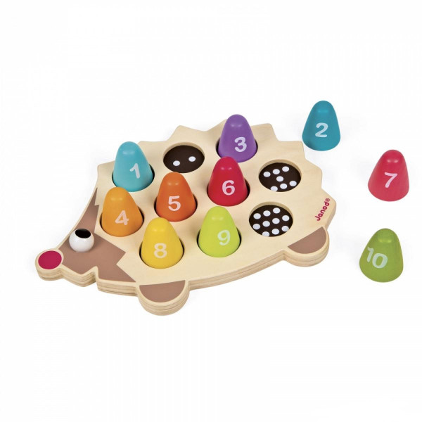 Zabavno učenje brojeva i boja. Neka vaši mališani kroz igru nauče boje i brojeve uz ovog veselog drvenog ježa! Svaka bodlja je obojena drugačijom bojom i nosi broj, dok se na telu ježa nalaze otvori sa odgovarajućim brojem tačkica. Dete treba da prebroji tačkice i pronađe bodlju sa odgovarajućim brojem, razvijajući logičko razmišljanje i veštine prepoznavanja. Učenje brojenja do 10.