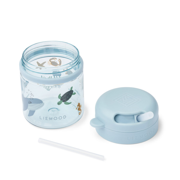 Čaša sa slamčicom ima jedinstveni mehanizam za zatvaranje uvrtanjem, što je čini savršenom za porodične izlete i vožnje u kolicima. Napravljena je od tritana, materijala koji je otporan na lomljenje, a izgleda kao staklo. Uključuje silikonsku slamčicu sa sistemom za protok vazduha, koji olakšava ispijanje.