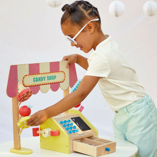 Set uključuje drveni pult sa policama, sladolede na štapiću, kolače, kašičicu, mini kasu i tablu za ispisivanje porudžbina. Deca mogu da preuzmu ulogu prodavca, kreiraju porudžbine i posluže “kupce” uz osmeh i maštovitu prezentaciju svojih slatkih kreacija. Igra podstiče razvoj govora, koordinacije i društvenih veština.