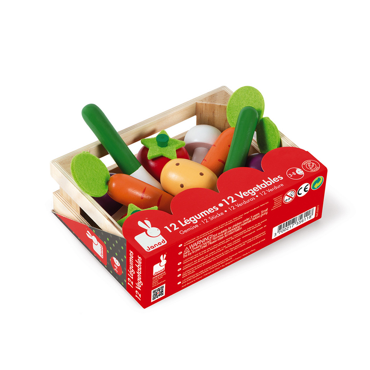 Ukupno 12 šarenih drvenih povrćki, savršenih za decu od 3 godine i više.