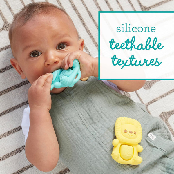 Mekane silikonske glodalice sa teksturama koje masiraju desni i istovremeno podstiču igru! Lako se kače na kolica ili torbu i uvek su pri ruci. Idealne za grickanje, stiskanje i zabavu u pokretu.