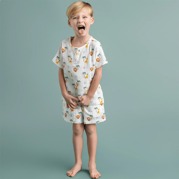 Otkrijte naš avanturistički kombinezon za plažu za dečake u džungli! Napravljen od lagane i prozračne tkanine, savršen za letnje aktivnosti. Ovaj set nudi udobnost i slobodu kretanja za dane pune zabave!