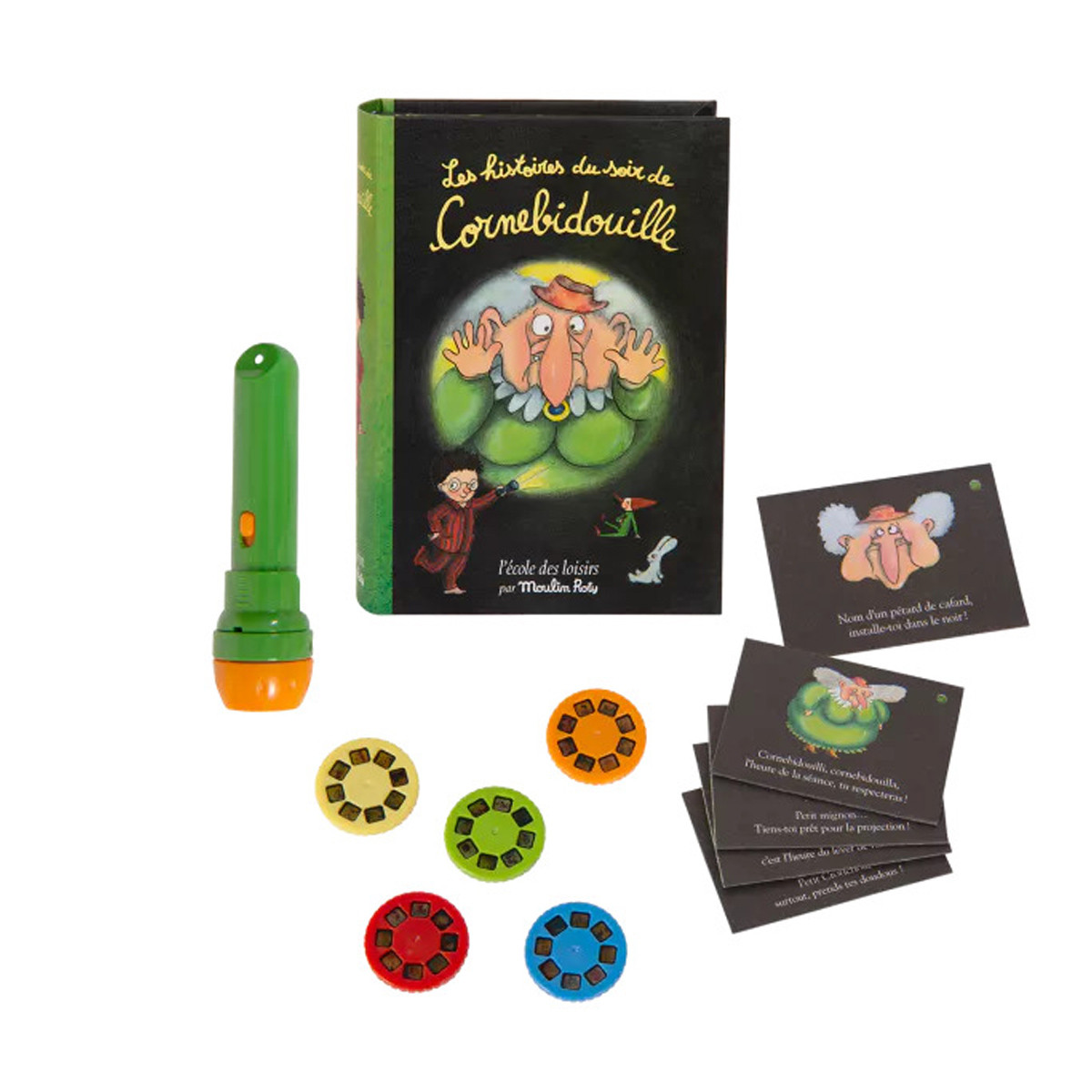 Lepo ilustrovana magnetna kutija sa projekcijskom ručnu lampom, 5 diskova i 5 pozivnica donosi zabavnu priču o veštici Kornebiduli. Ovaj mini bioskop podstiče maštu, interakciju i kreativnost kod dece. Projektujte na zidu, svaki od diskova nosi priču koja će oduševiti mališane.
