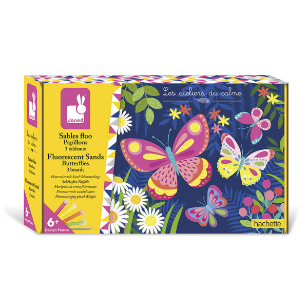 Komplet sadrži tri slike sa prelepim motivima leptira. Svaka slika može biti ukrašena sa četiri različite boje fluorescentnog peska. Deca će koristiti bambusovu iglu kako bi pažljivo uklonila film koji pokriva samolepljive delove slika. Nakon toga, pesak se ređa preko tih delova, stvarajući jedinstvene dizajne i otkrivajući postepeno izuzetan spektakl leptira u pokretu.