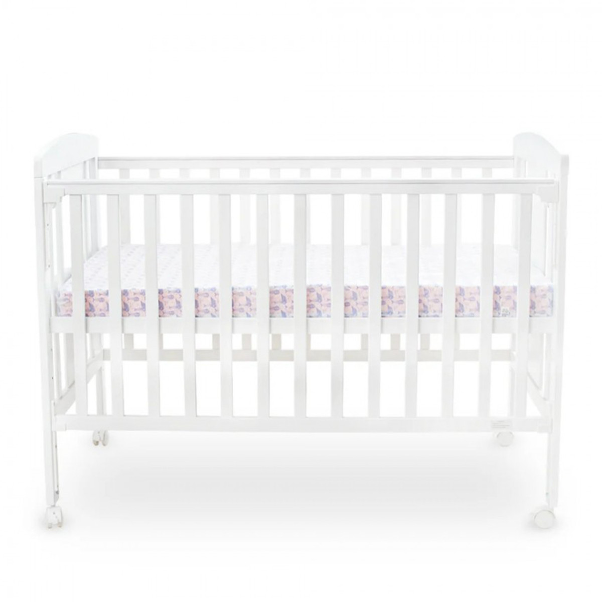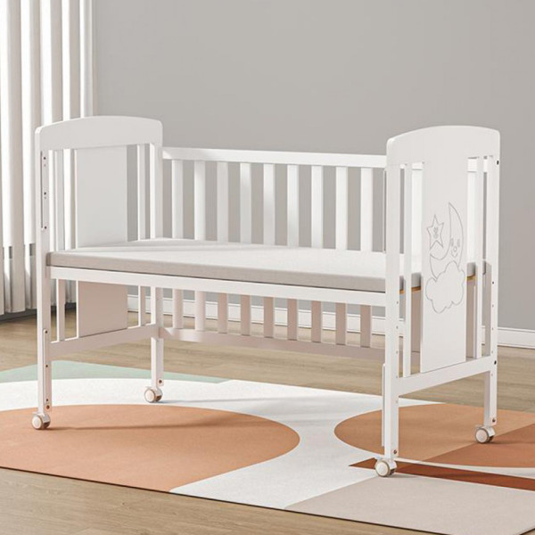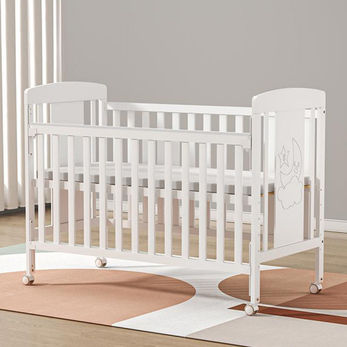 Drveni krevetac za bebe – beli, sa točkićima i podesivom prednjom stranom. Izrađen od drveta novozelandskog bora. Omogućite svom detetu miran i siguran san uz ovaj kvalitetan drveni krevetac u elegantnoj beloj boji. Praktičan i funkcionalan dizajn prilagođava se potrebama i rastu vaše bebe.