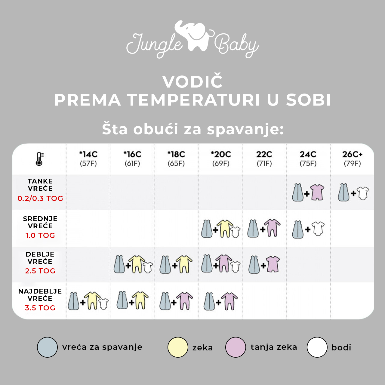 A vodič za oblačenje pruža uputstva o tome kako da oblačite bebu, tj. kako da kombinujete odevne predmete i vreće za spavanje u odnosu na sobnu temperaturu.