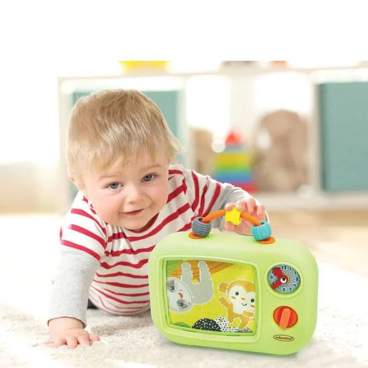 Muzički TV sa veselim životinjama donosi zabavnu paradu prijateljskih likova praćenu razigranim melodijama. Na ekranu se smenjuju šarene scene koje privlače pažnju, dok tri perlice različitih tekstura na dršci pozivaju na dodirivanje, okretanje i klizanje. Tu je i mali sat, sjajan za prvo upoznavanje sa pojmom vremena. Zahvaljujući praktičnoj dršci, ova igračka lako putuje svuda sa bebom, nudeći sate zabave i podstičući razvoj motorike i koordinacije pokreta.
