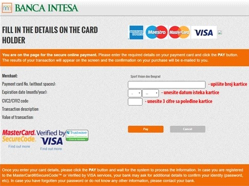 *Unos i provera podataka isključivo se obavljaju između korisnika kartice i banke Intesa, a Internet trgovac nema uvid u podatke koji se razmenjuju.