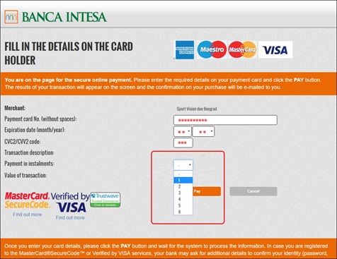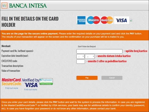 *Unos i provera podataka isključivo se obavljaju između korisnika kartice i banke Intesa, a Internet trgovac nema uvid u podatke koji se razmenjuju.
